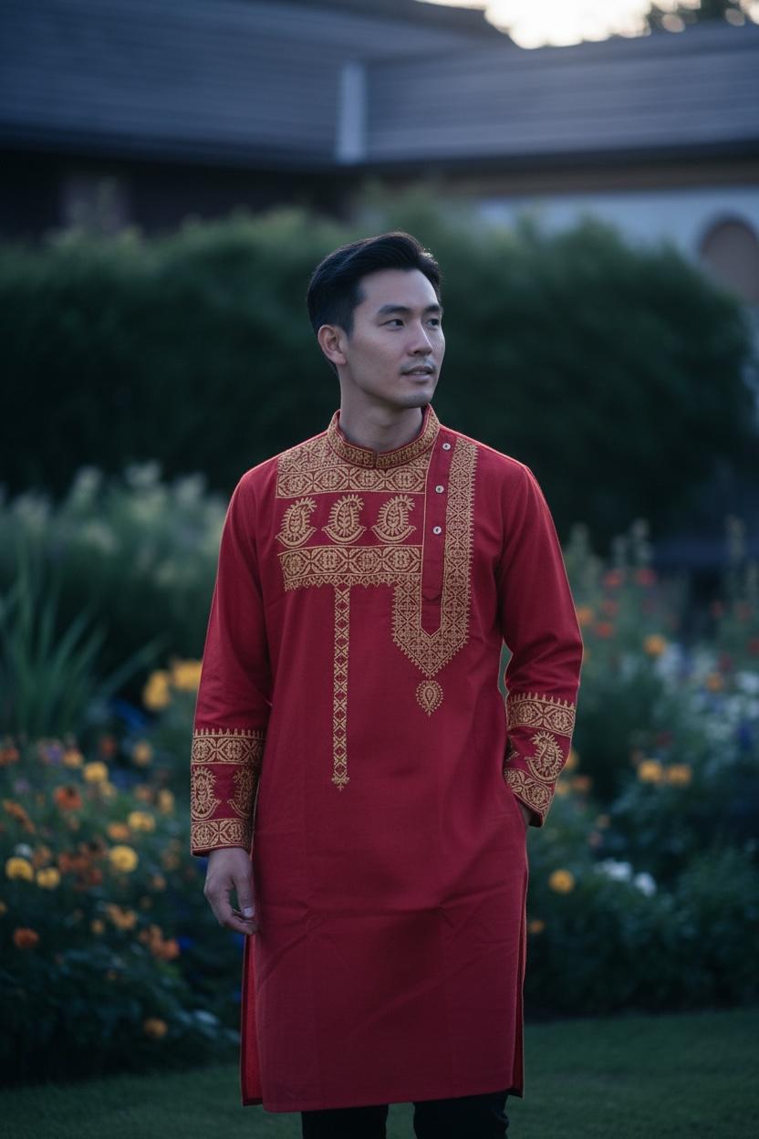 RED COLOR TANT COTTON KURTA WITH BEAUTIFUL GOLDEN EMBROIDERY WORK AROUND THE NECK