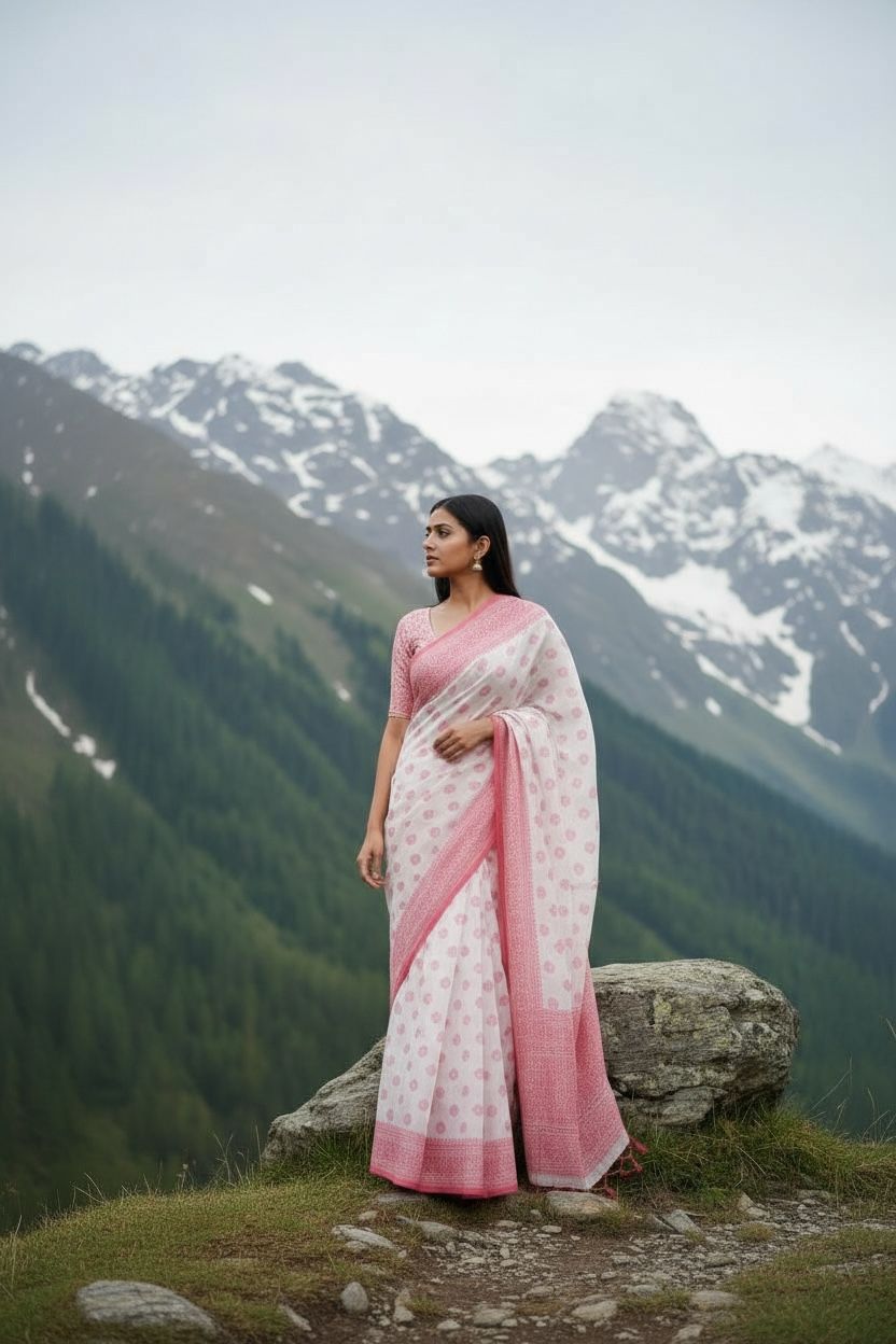 AN ELEGANT RED AND WHITE DHUPIA SILK SAREE WITH UNSTITCHED BLOUSE . SUITABLE TO WEAR AT FESTIVALS AND POOJA. IT IS EXTREMELY EASY TO WEAR.