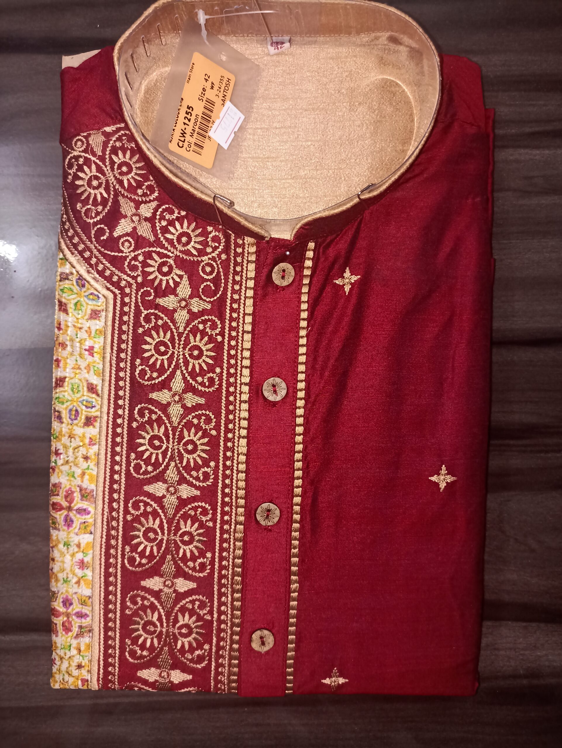 This red embroidered kurta combines elegance and comfort—perfect for traditional gatherings and pujas.