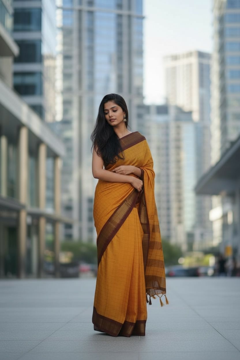 ELEGANT YELLOW AND MAROON SAREE WITH UNSTITCHED BLOUSE. SUITABLE FOR ALL PURPOSES