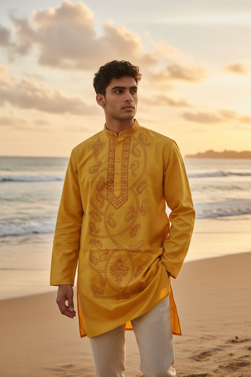 YELLOW SILK MIX GENTS KURTA